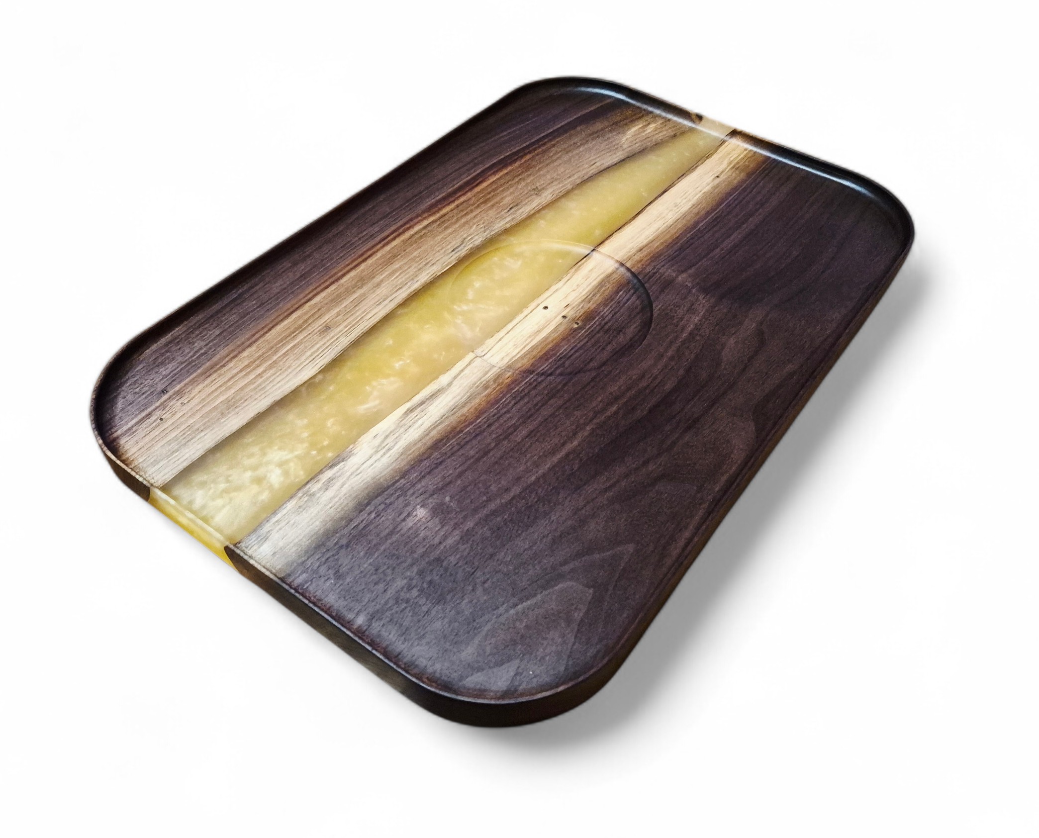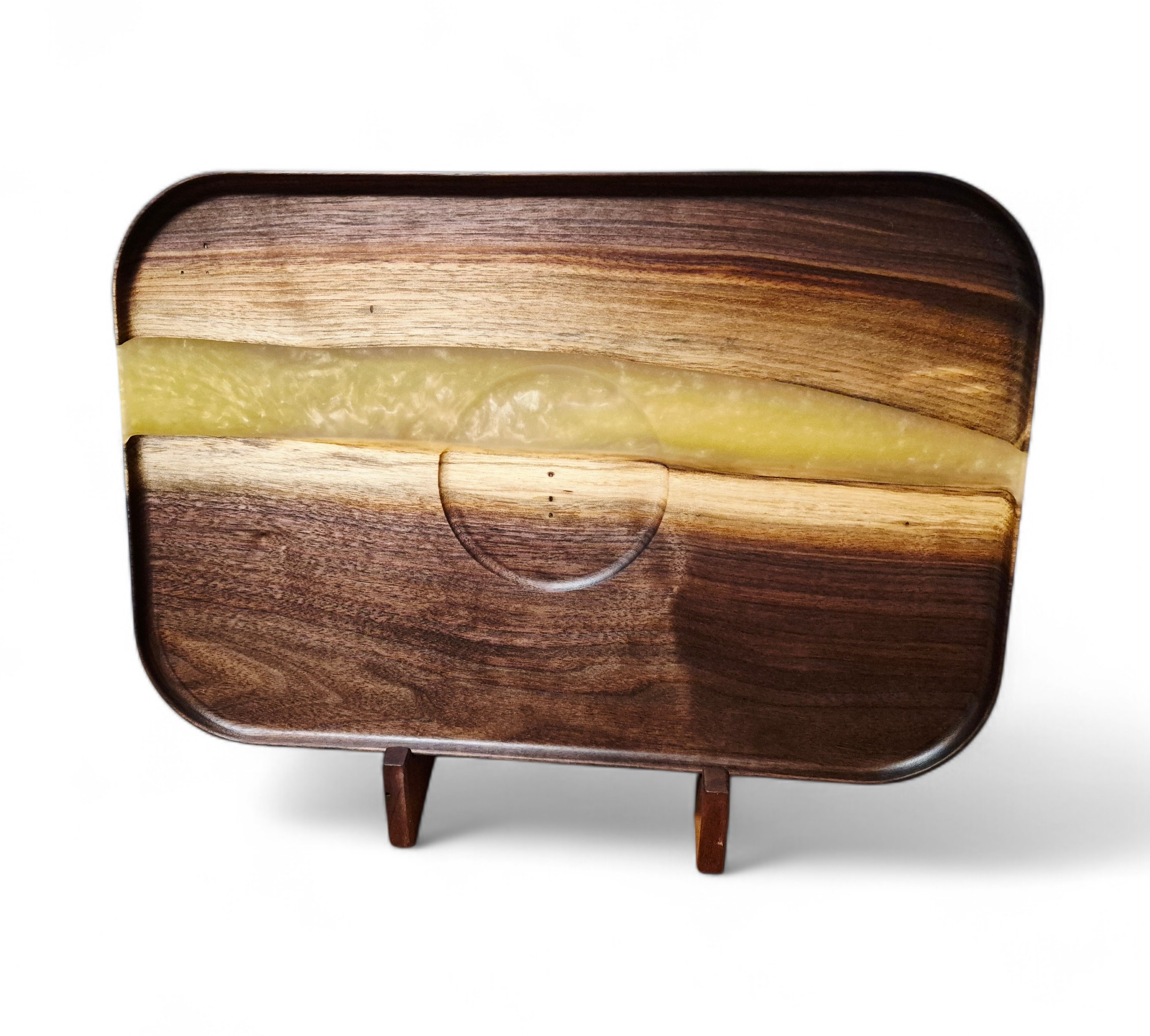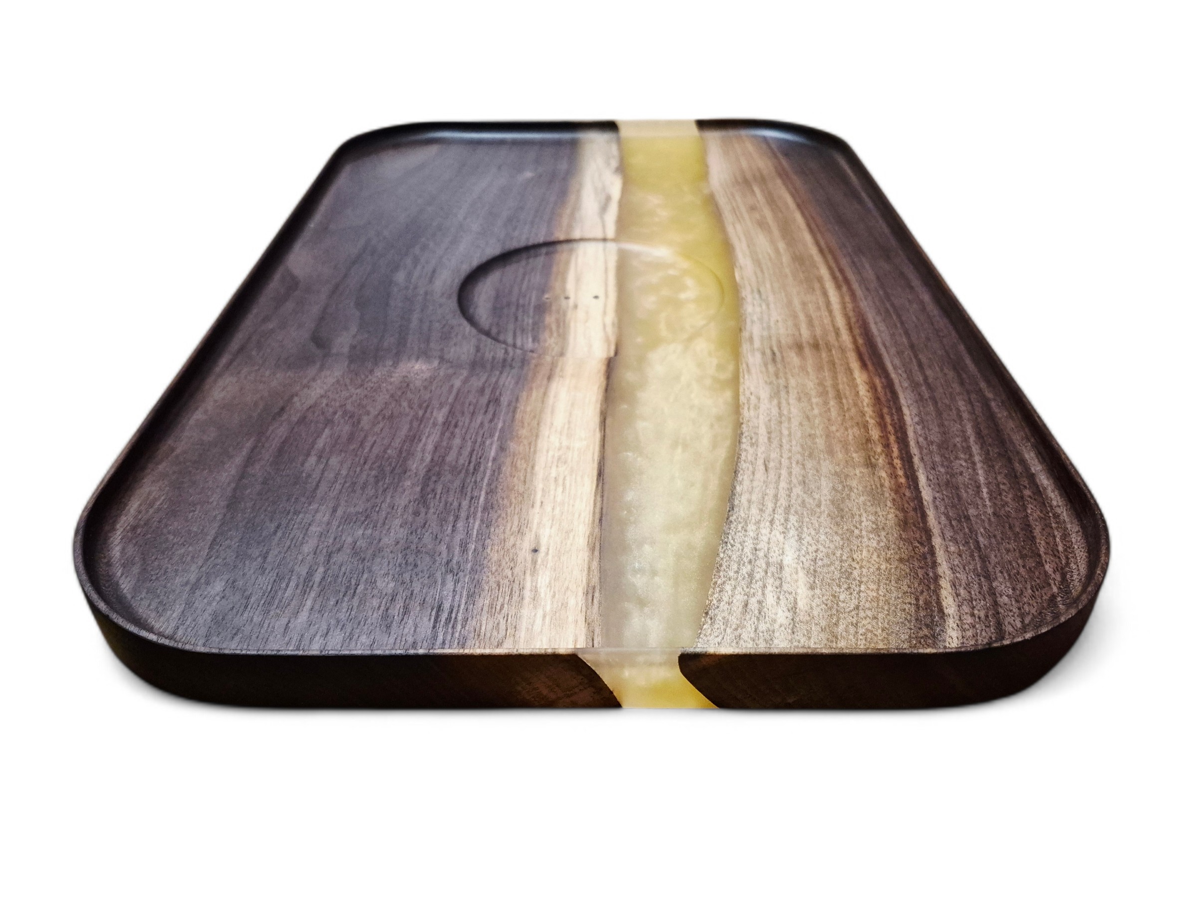 Handwash with soap and water and keep from soaking for extended periods of time. Avoid cutting on epoxy resin as it may damage the piece. Finished with food safe mineral oil and beeswax, can be periodically conditioned with either to maintain peak quality.