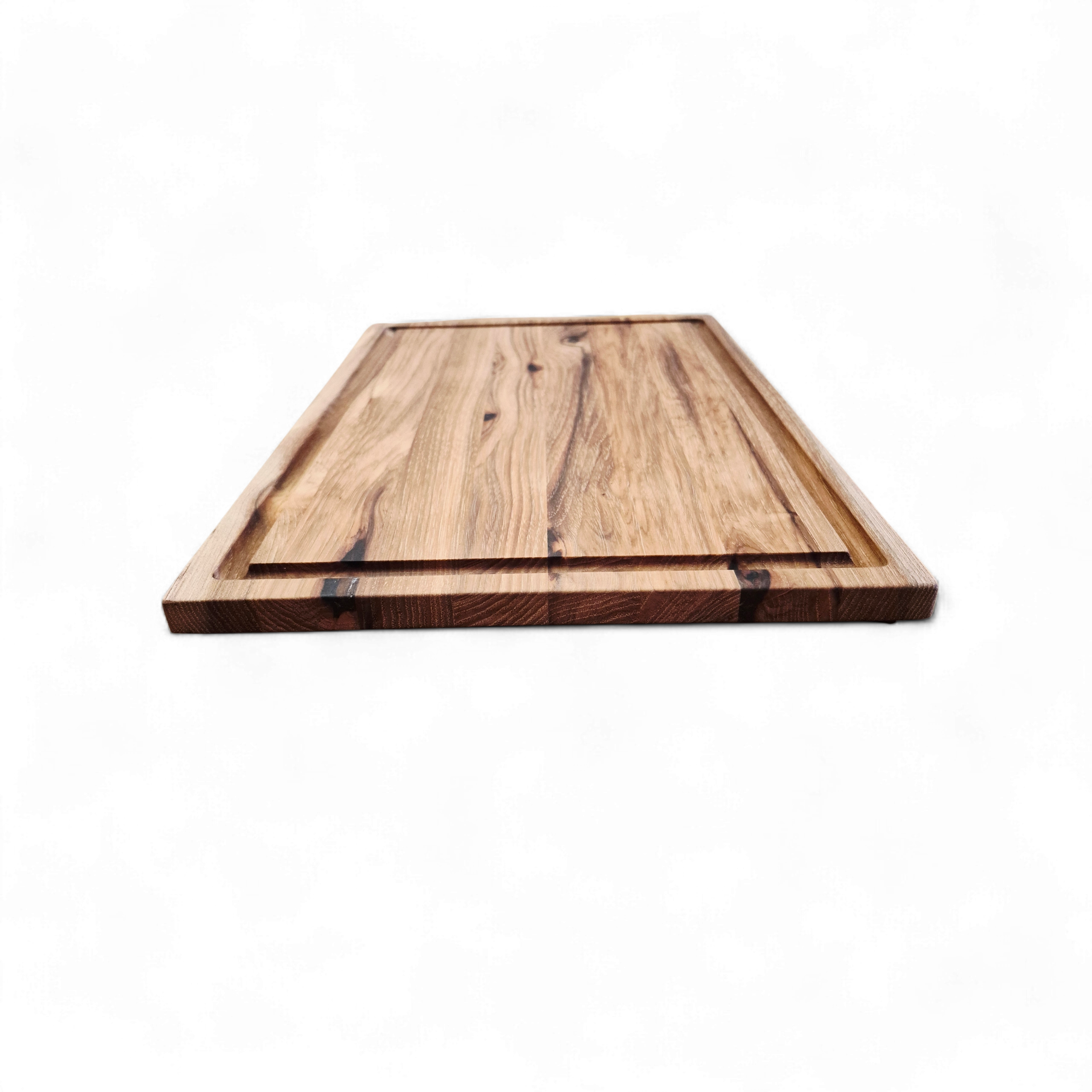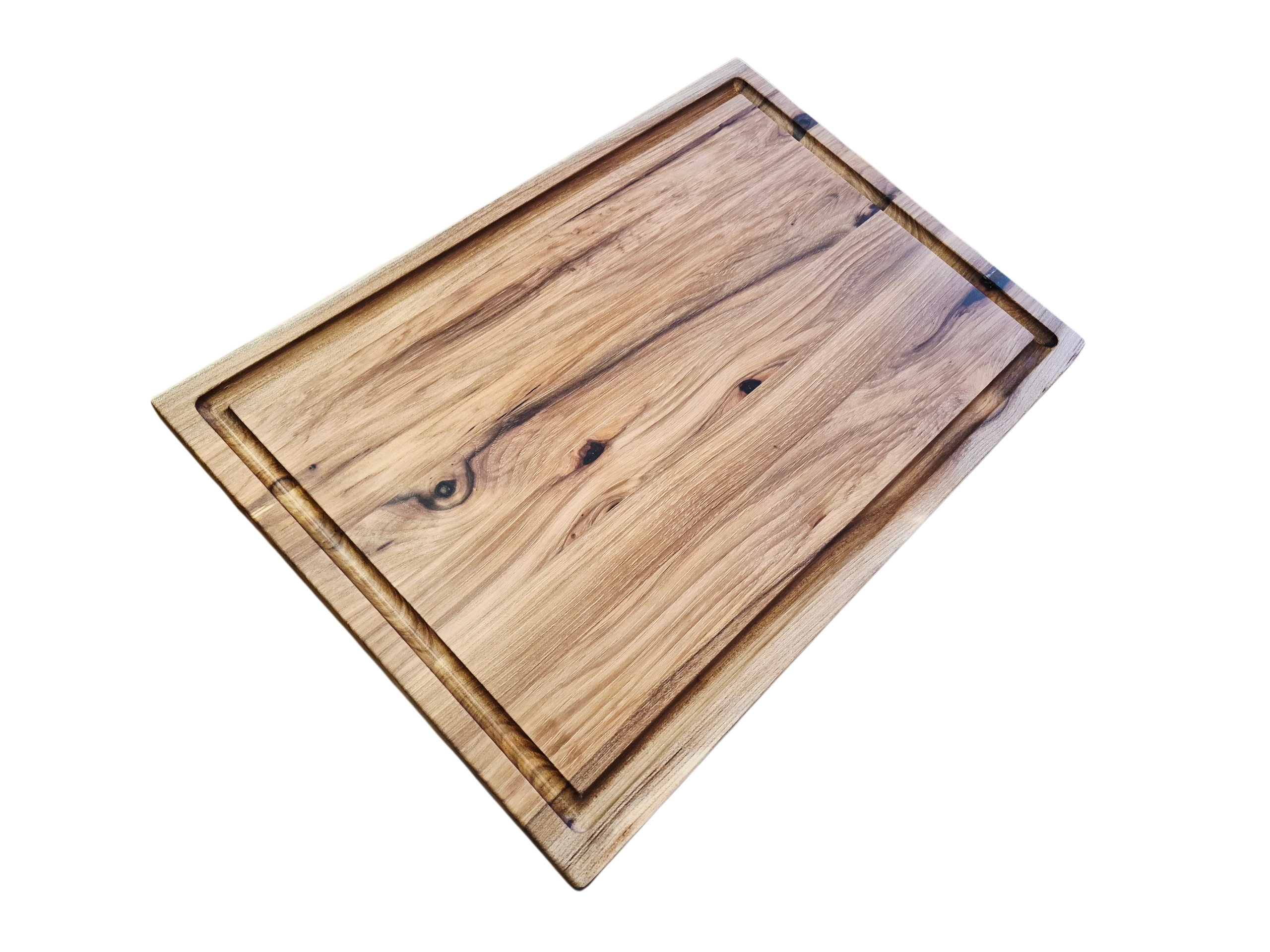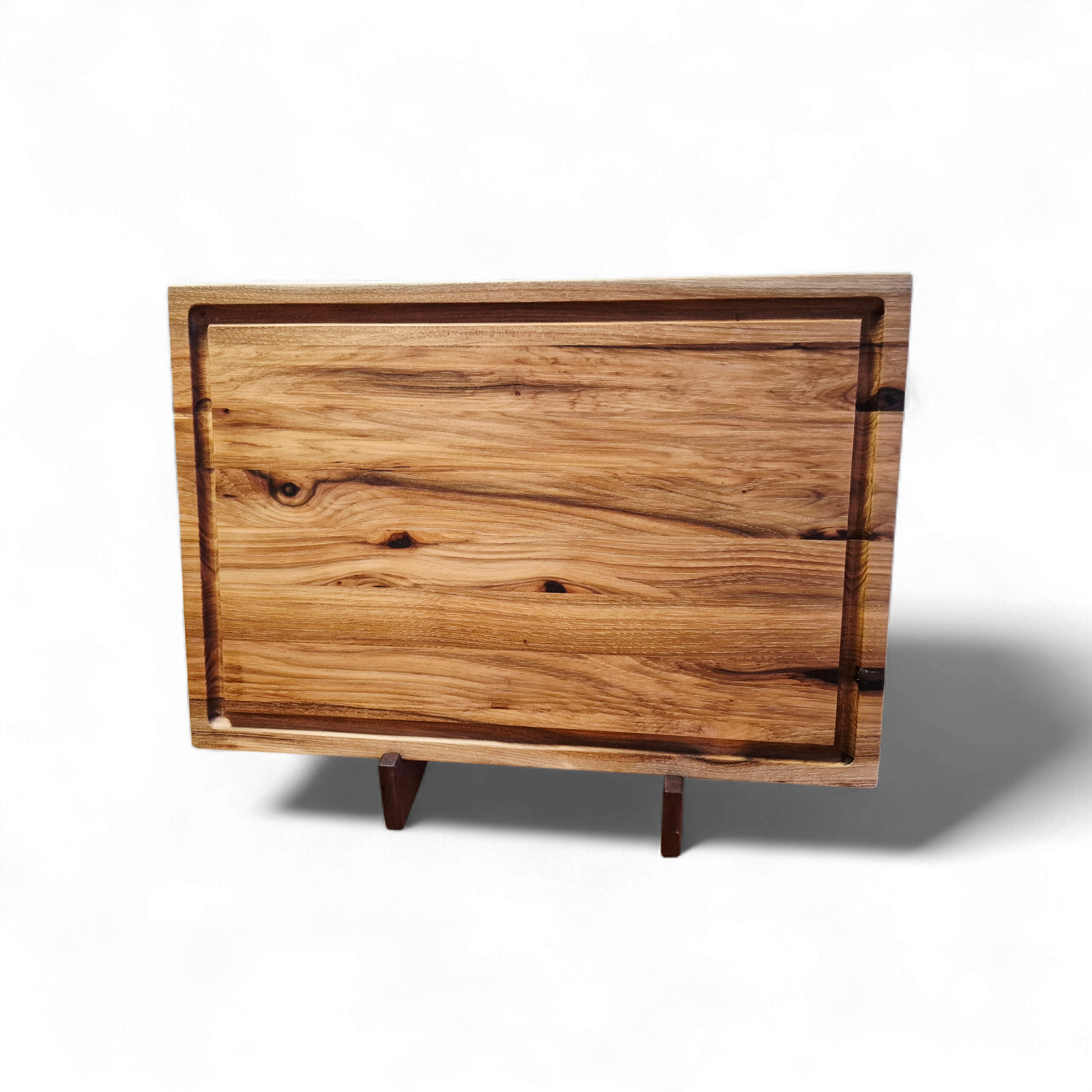 Finished with a food safe mineral oil and beeswax combination. Can be periodically treated with either to keep the board in top condition. Handwash with soap and water and avoid letting it soak for extended periods of time. Make sure to allow air flow to both top and bottom of board while drying to prevent warping.