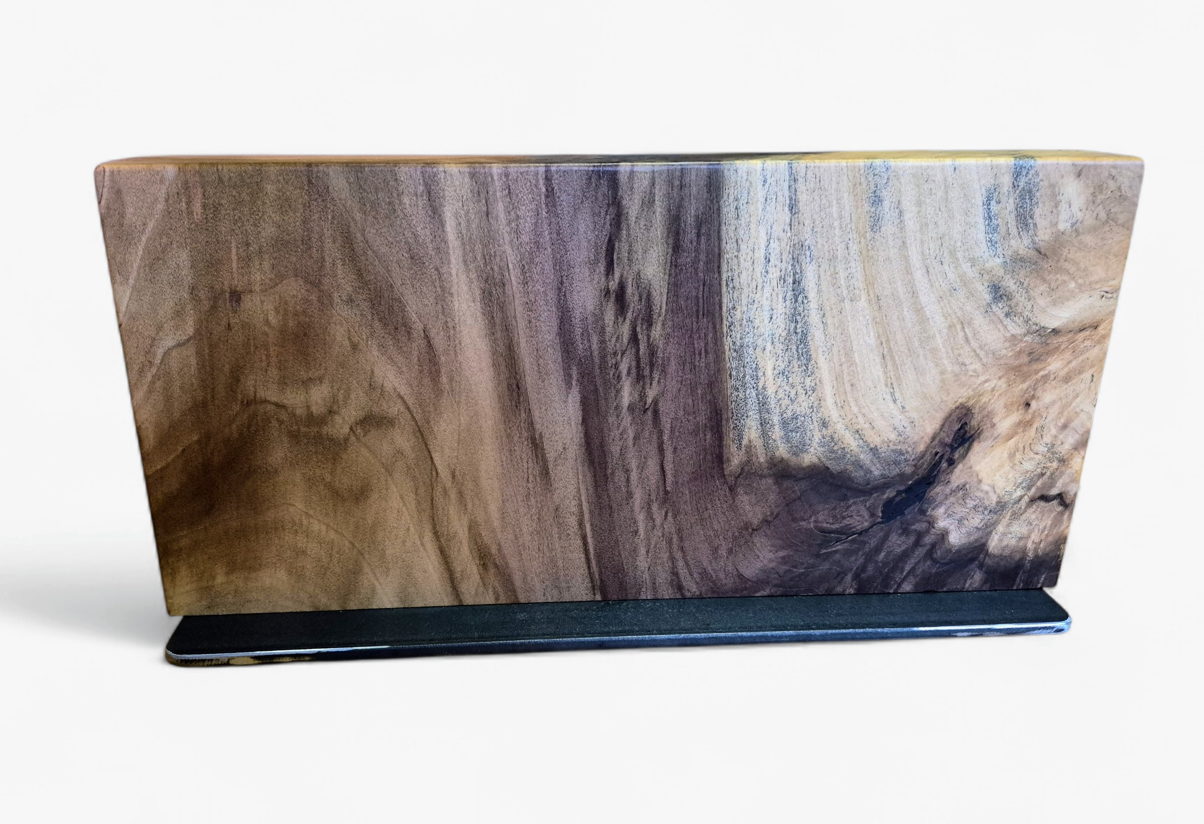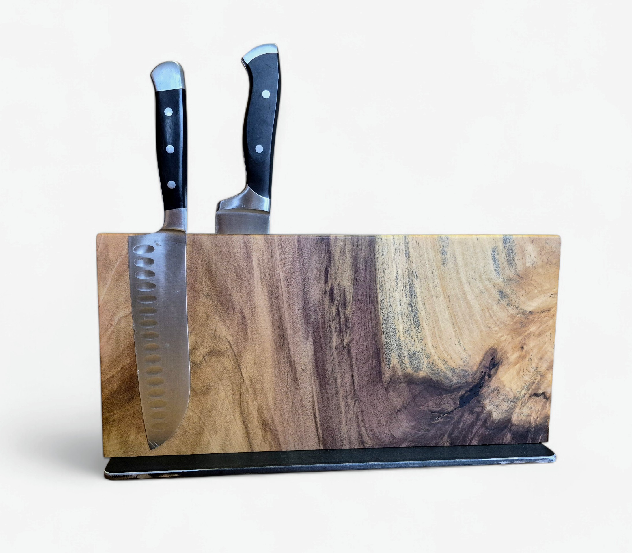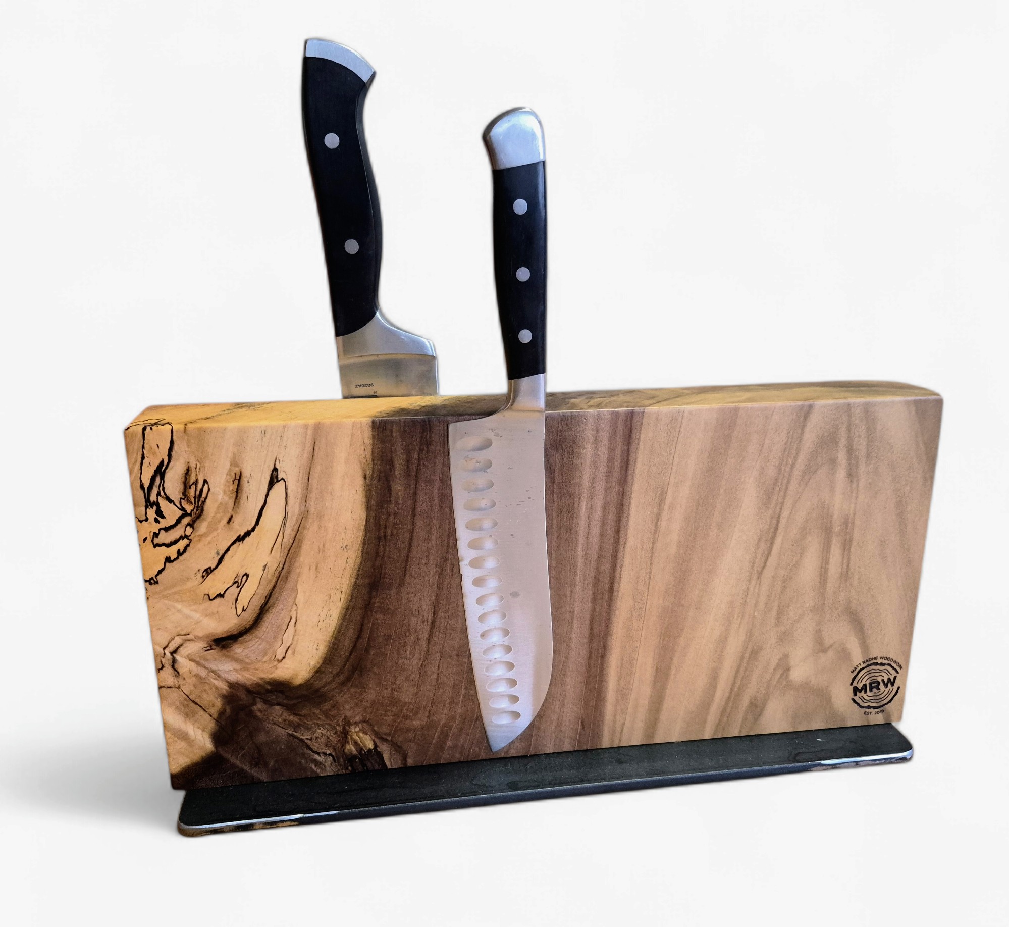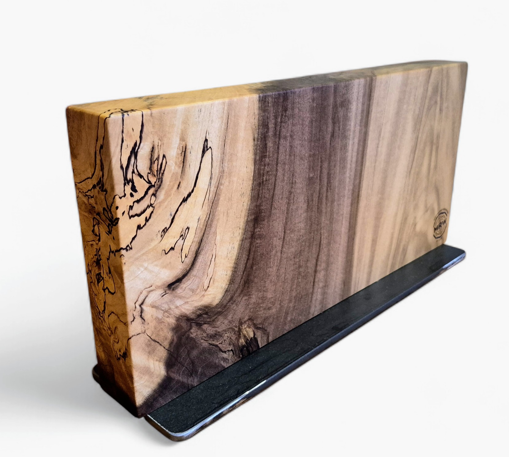 Stunning grain patterns in this solid poplar knife block. Double sided and wide enough to comfortably hold up to 7 large kitchen knives on each side. Heavy duty metal baseplate provides extra stability and a unique industrial touch.